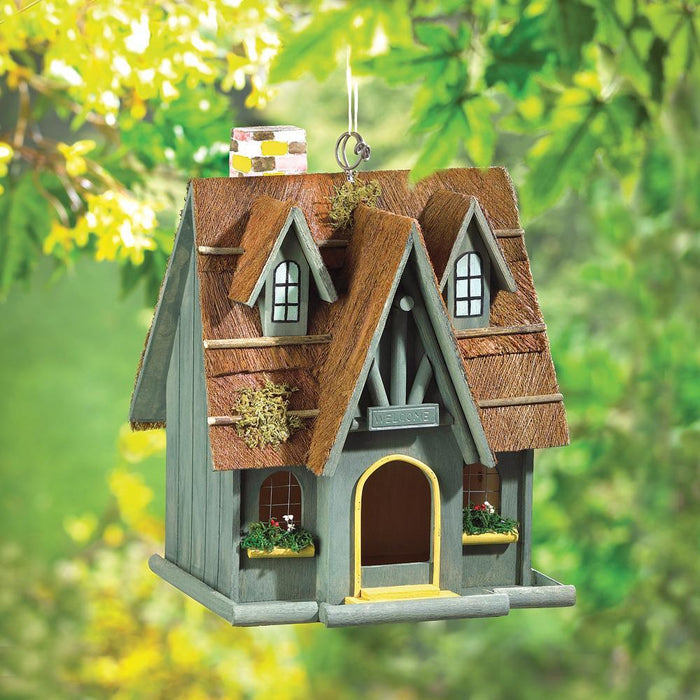 A cute cottage with a 2 1/8" x 2 7/8" door, this delightful birdhouse with thatch roof, chimney and flower boxes will be a welcome addition to many different birds in your garden.